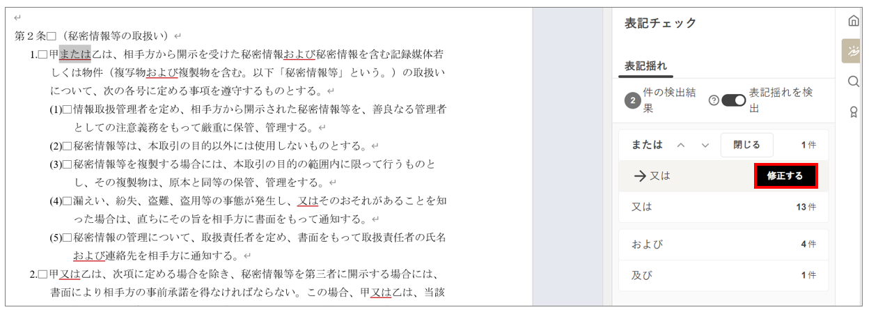 表記揺れの場合は、[修正する] をクリックすることで本文が修正されます。