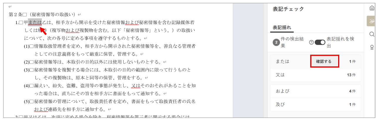 ドキュメント本文中で表記揺れおよび修正漏れの箇所に赤の下線が付き、下線の引かれた語句をクリックすると、画面右側に表記揺れの一覧が表示されます。
