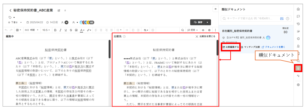 編集画面右側の縦メニューから [類似ドキュメント] をクリック > 提案された類似ドキュメントの一覧から、比較したいドキュメントの [比較編集する] をクリックすると、編集画面の右隣に当該類似ドキュメントが「比較先」として表示されます。