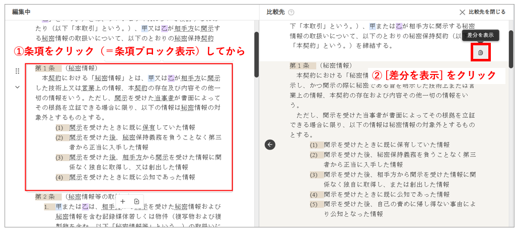 左側の「編集中」の方で、任意の条項をクリックしてから、右側の「比較先」の方で、比較したい条項にカーソルを置きます(当該条項がグレー背景に)。