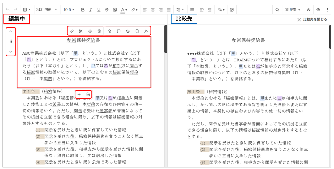 「編集中」の方は、条項をクリックすると条項ブロックが表示され、各種条項メニューが使えますが、「比較先」の方は編集できません。