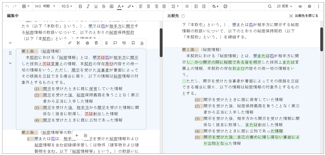 右側の比較先の条項と見比べながら、左側の編集中の条項ブロックで編集を行っていきます。