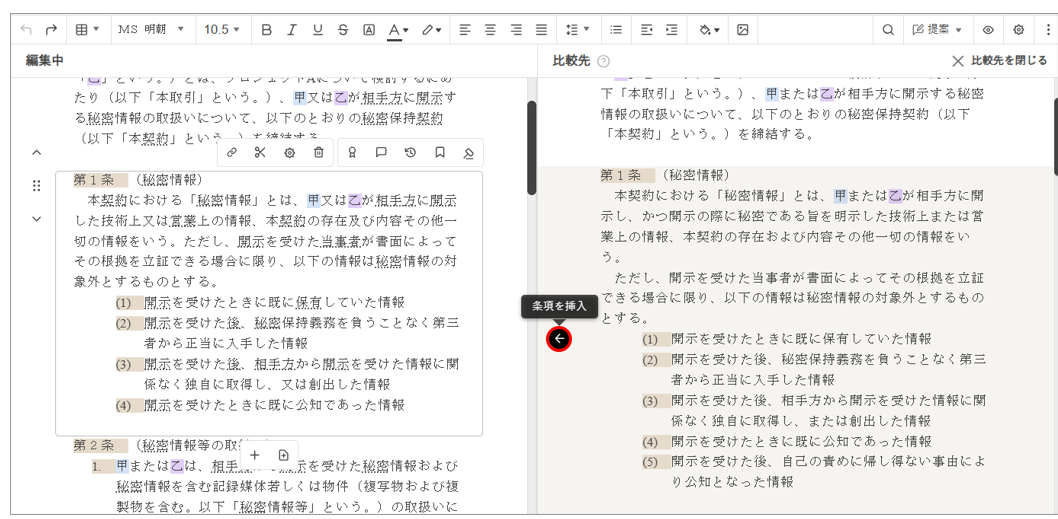 比較先の条項にカーソルを置き、[条項を挿入] ボタンをクリックすると、当該条項を編集中の条項に挿入(置き換え)することができます。