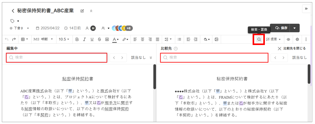🔍[検索・置換] ボタンをクリックすると、「編集中」および「比較先」の両方で、検索ボックスが表示されます。