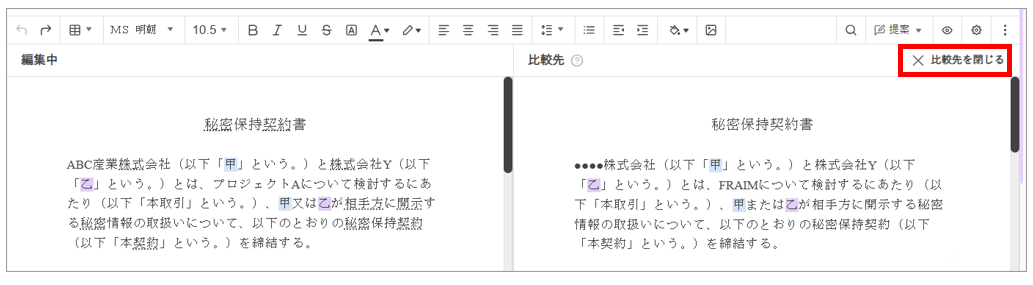 [比較先を閉じる] をクリックすると、通常の編集画面になります。