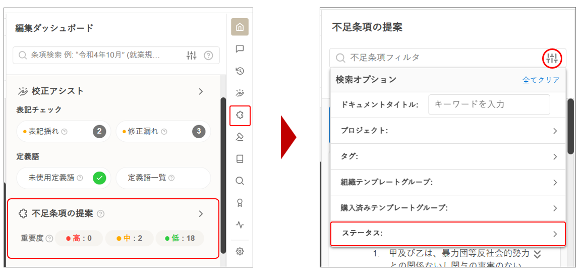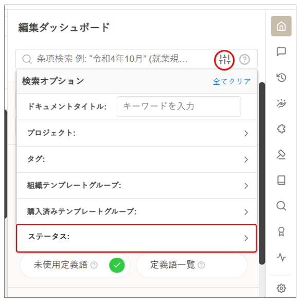 画面右側の編集ダッシュボードの [条項検索] ボックスにキーワードを入力* > フィルタボタンをクリック > 「ステータス」で絞り込み