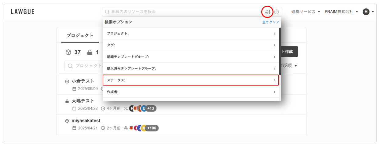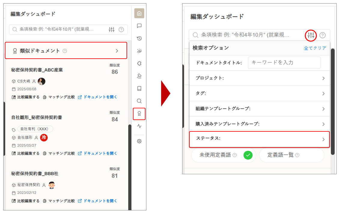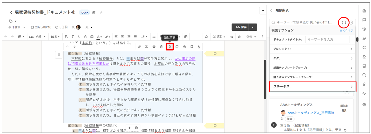 条項メニューから [類似条項] ボタンをクリック > 右側に検索結果が表示されたら、フィルタボタンをクリック > 「ステータス」で絞り込み