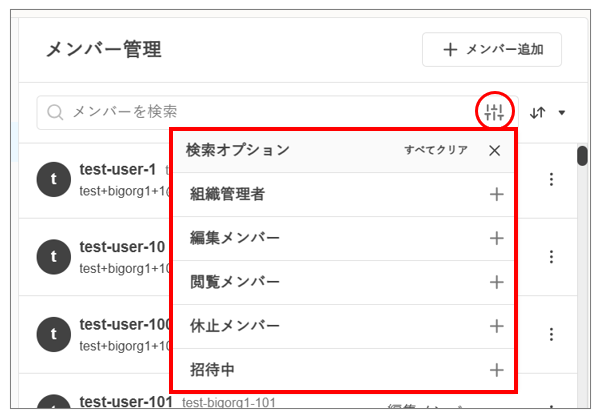 フィルタリングボタンをクリックすると、メンバーの権限で絞り込むことができます。