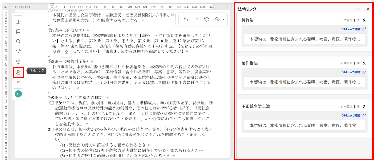Wordファイル上の法令名の記載箇所に法令データベースへのリンクが自動で張られるため、ワンクリック*で当該法令の内容を確認できます。