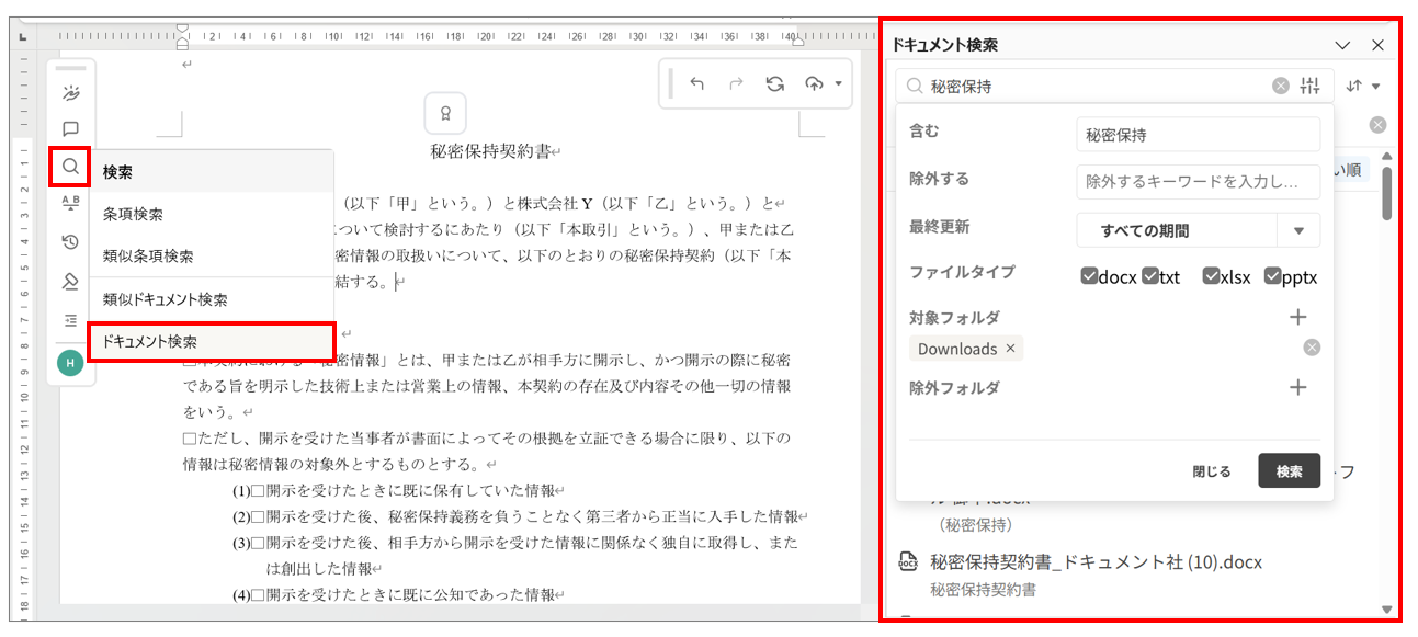 検索欄に入力した単語を含むドキュメントを、フォルダおよびファイルタイプを指定して検索することができます!