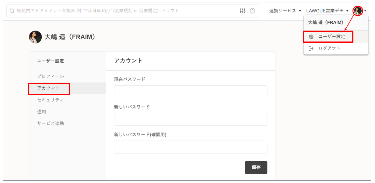 画面右上のアイコンをクリック > ユーザー設定 > アカウントをクリック。